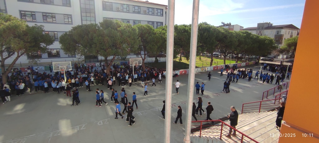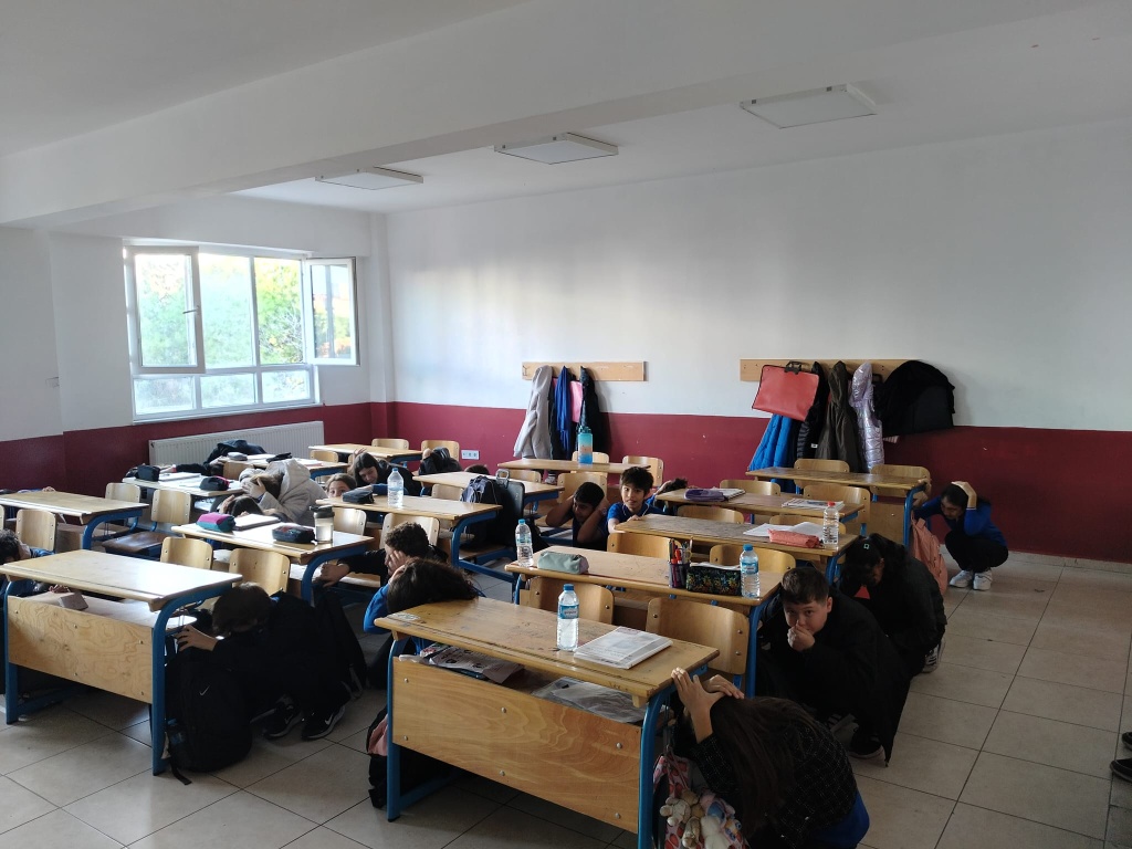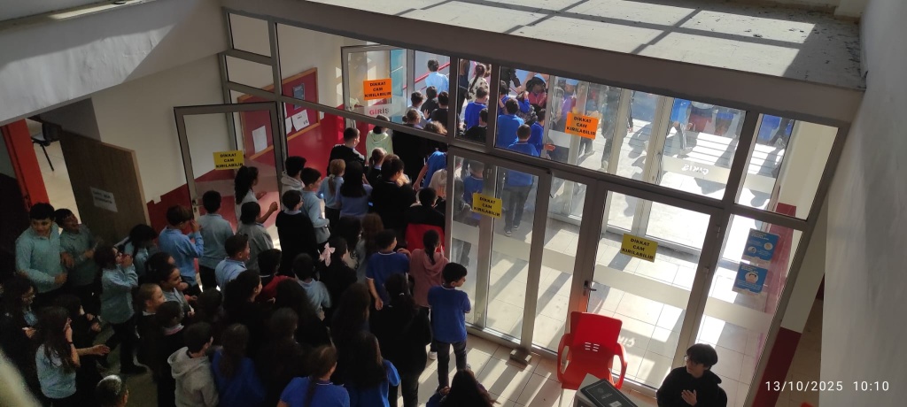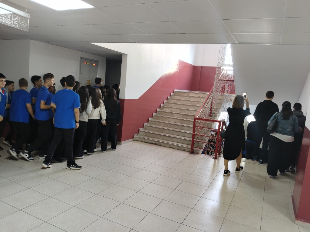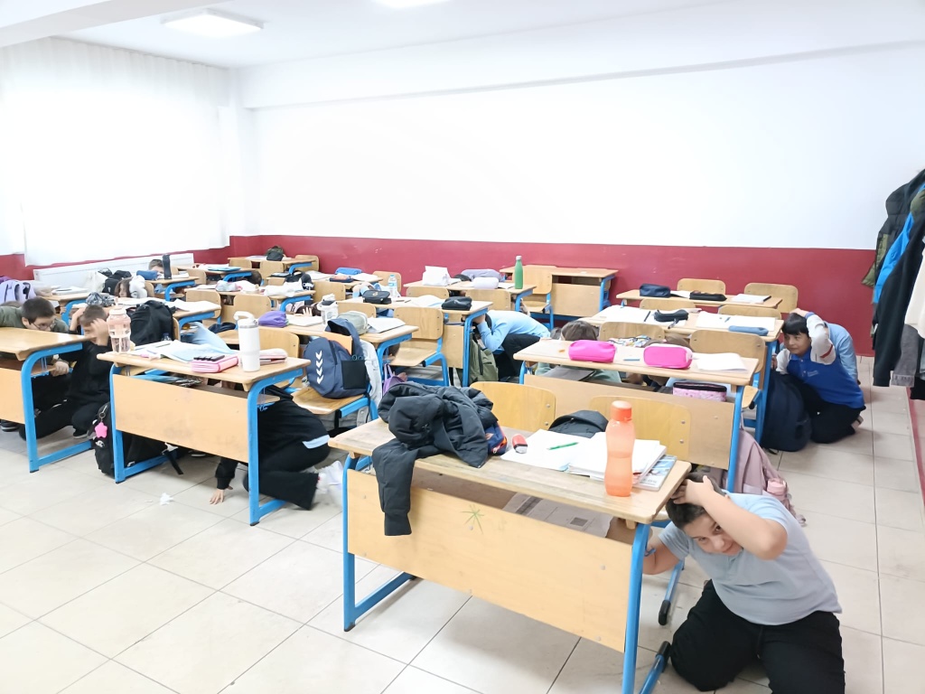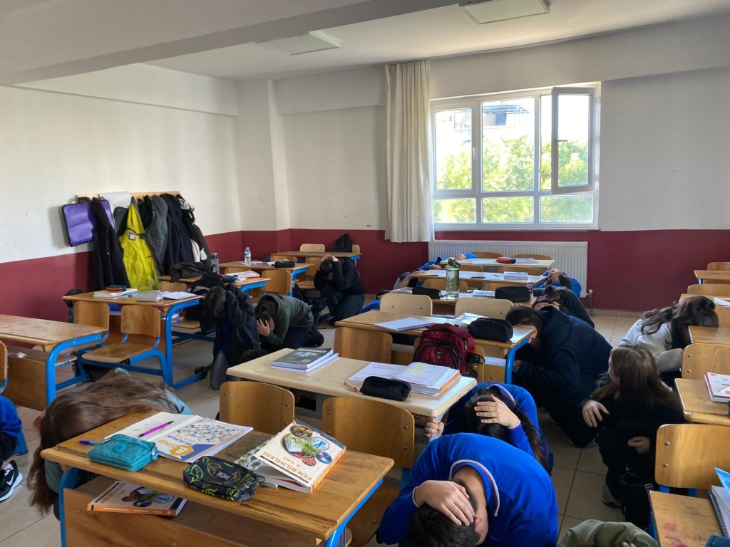 Tatbikat için çalan siren sesi ile Çök-Kapan Tutun Uygulaması yaptık ve okulumuzu tamamen boşaltmamız 2 dakika 30 saniye sürdü.