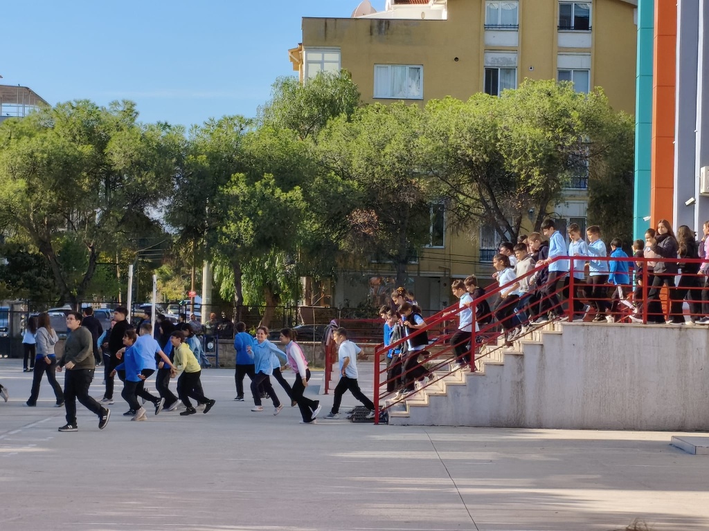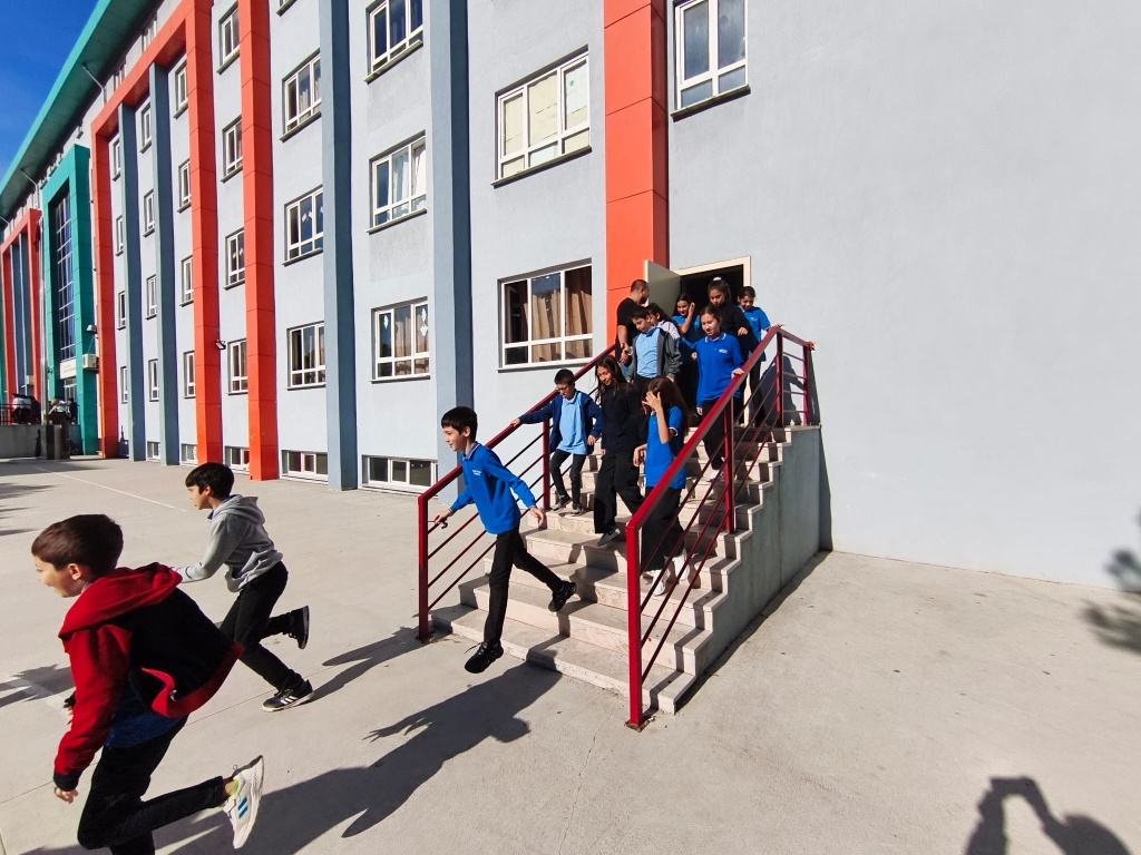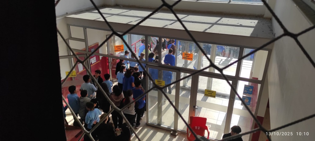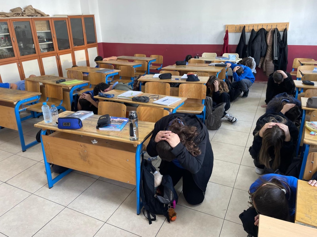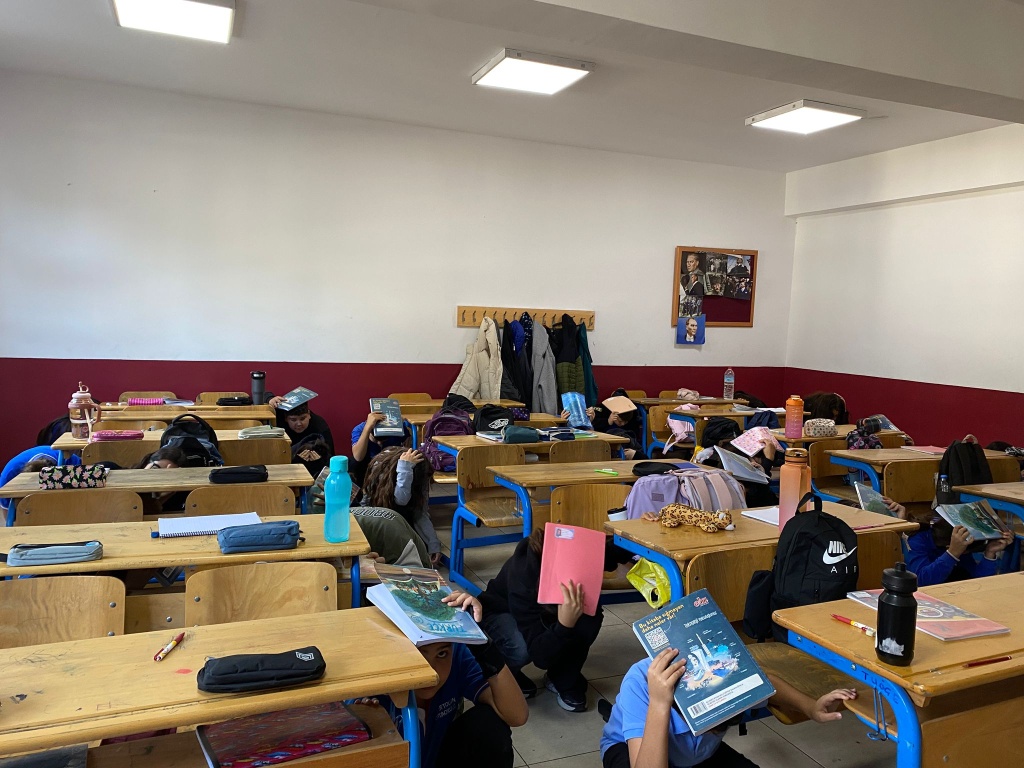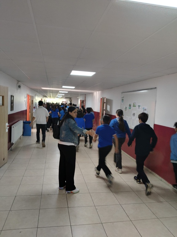 Tatbikat için çalan siren sesi ile Çök-Kapan Tutun Uygulaması yaptık ve okulumuzu tamamen boşaltmamız 2 dakika 30 saniye sürdü.