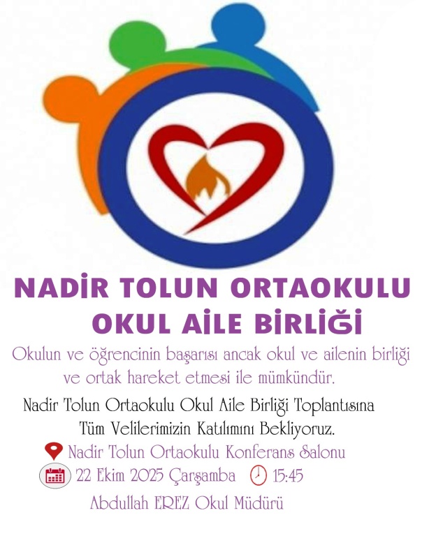 Burhaniye Nadir Tolun Ortaokulu Okul Aile Birliği Olağan Genel Kurulu 22 EKİM 2025 ÇARŞAMBA günü saat 15.45 da okulumuz Konferans Salonunda yapılacak olup, toplantıya katılmanızı önemle rica ederim.